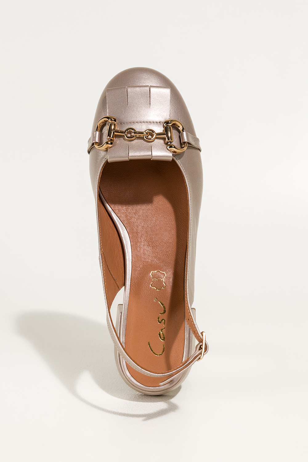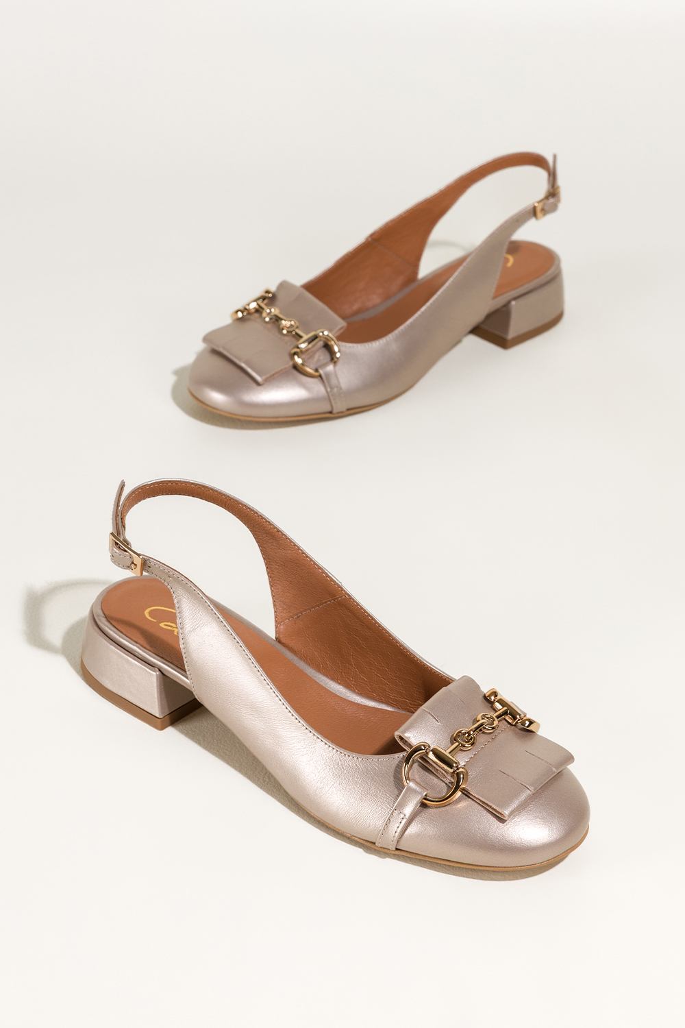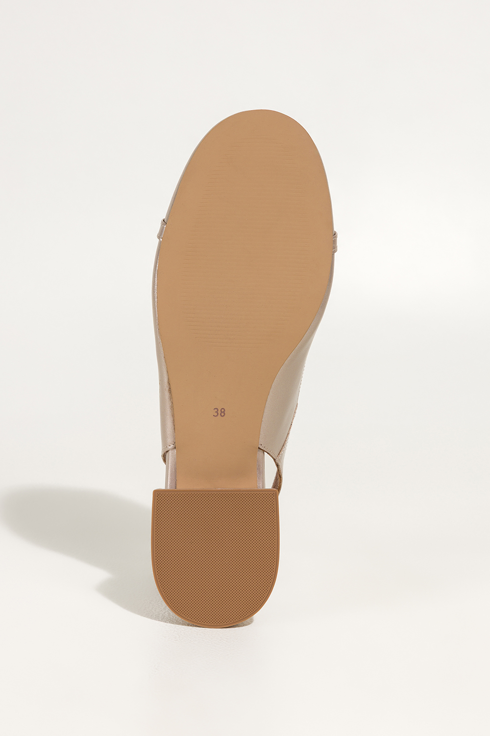 Złote czółenka skórzane damskie na niskim obcasie odkryta pięta złota ozdoba PRODUKT POLSKI Casu 70