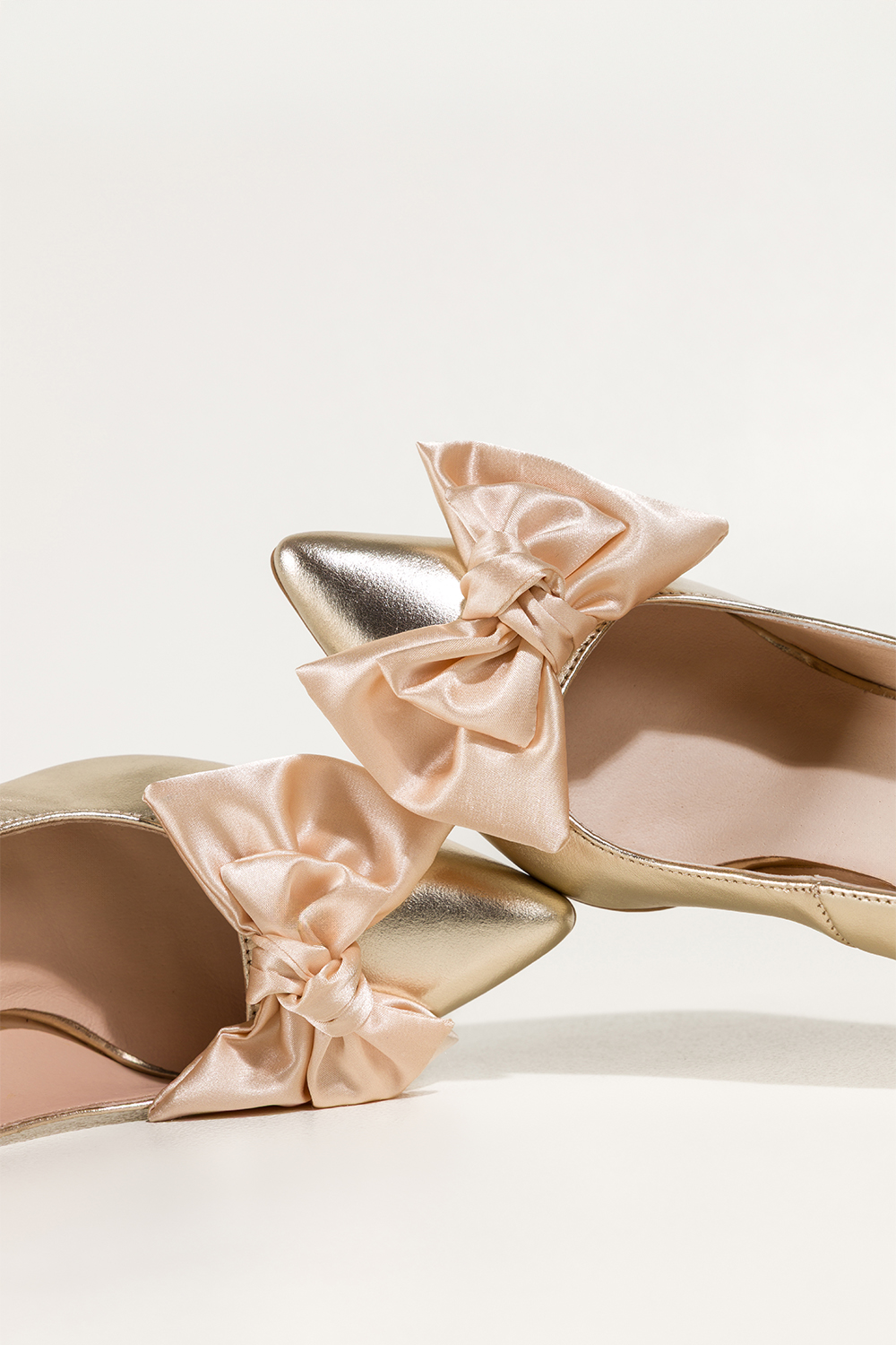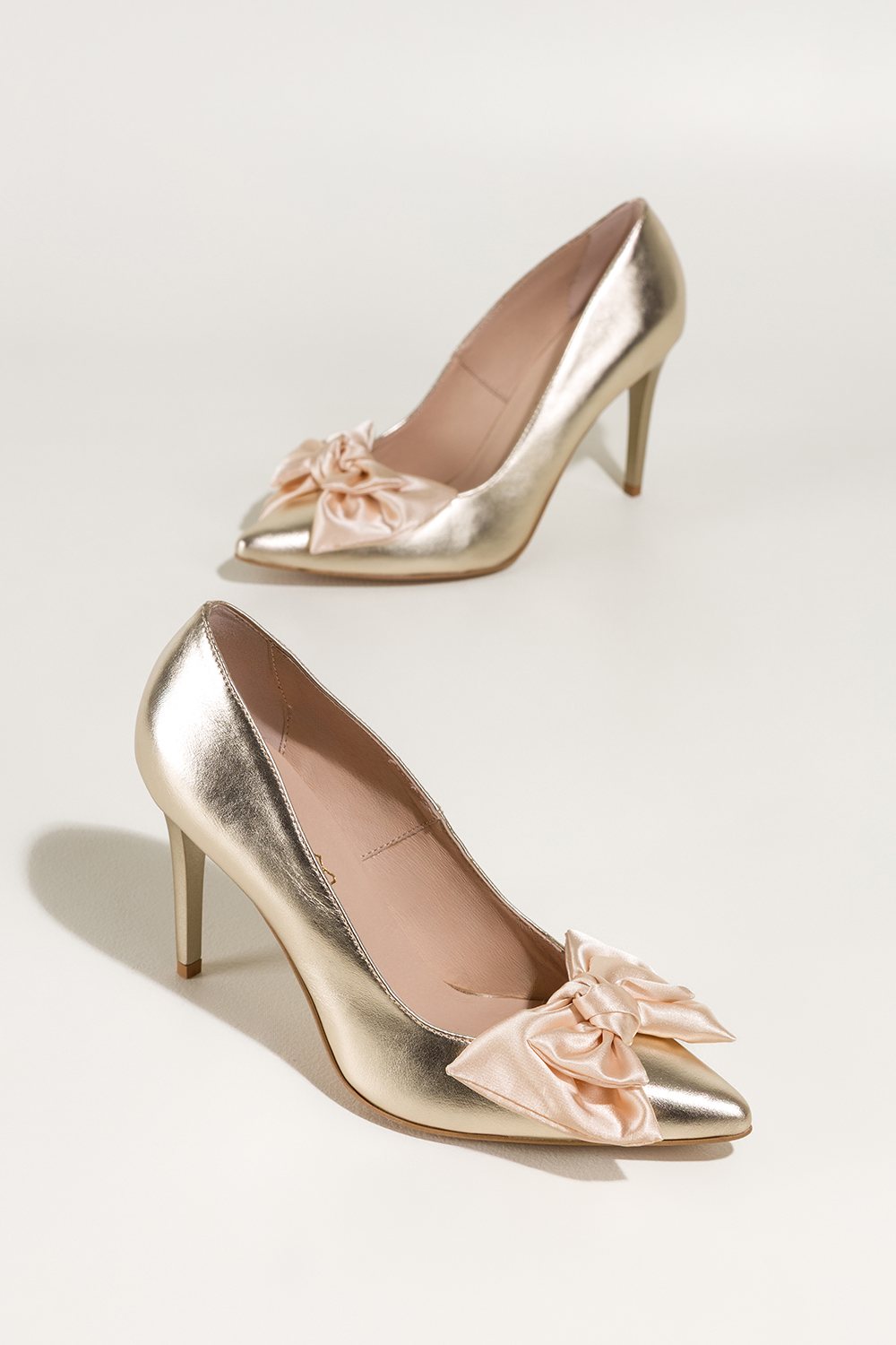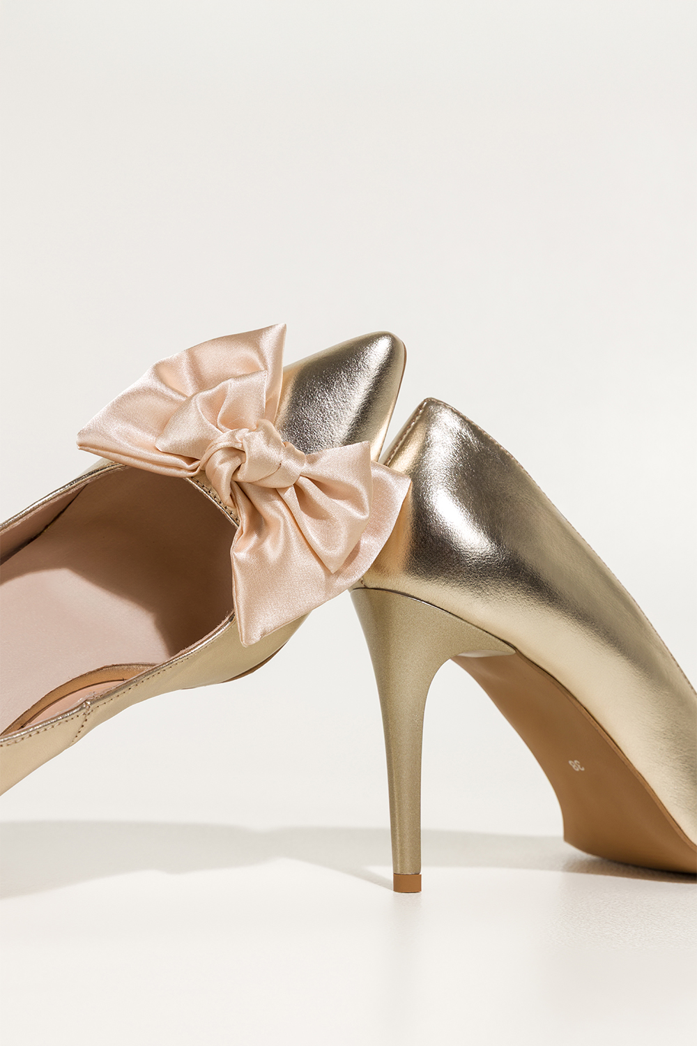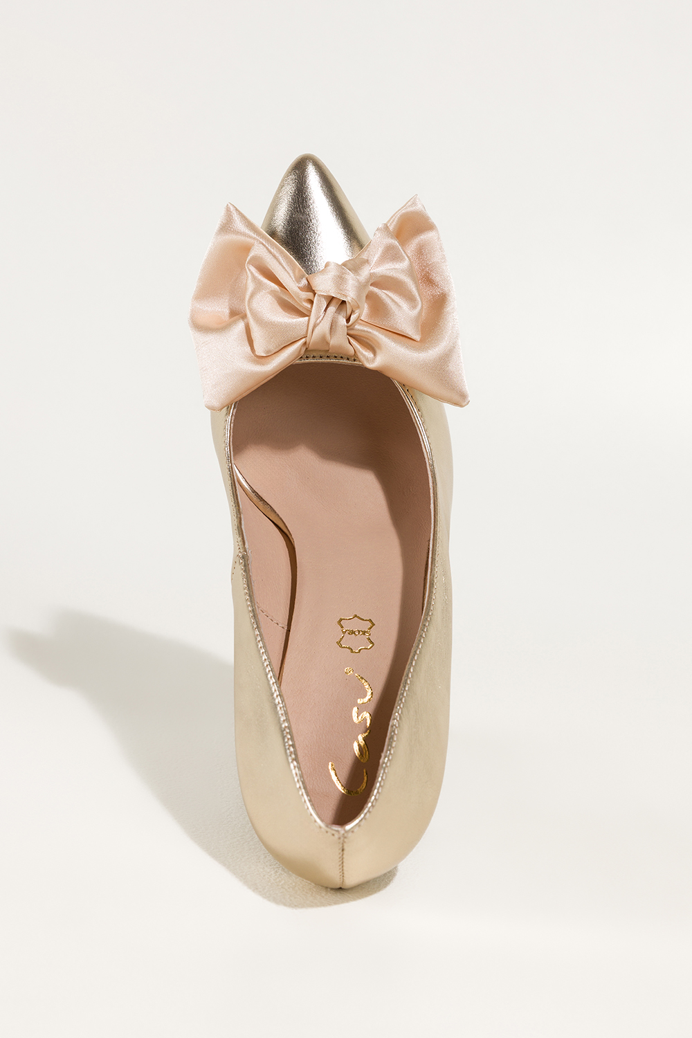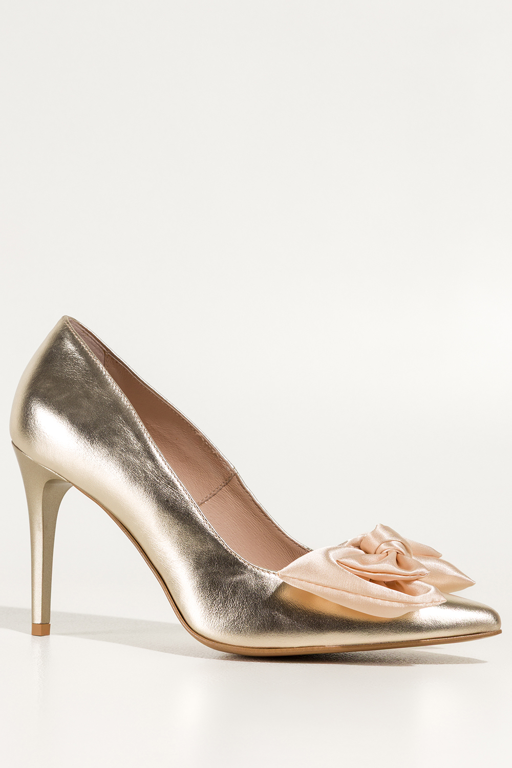 Złote czółenka skórzane damskie szpilki z satynową beżową kokardą PRODUKT POLSKI Casu 7006-296