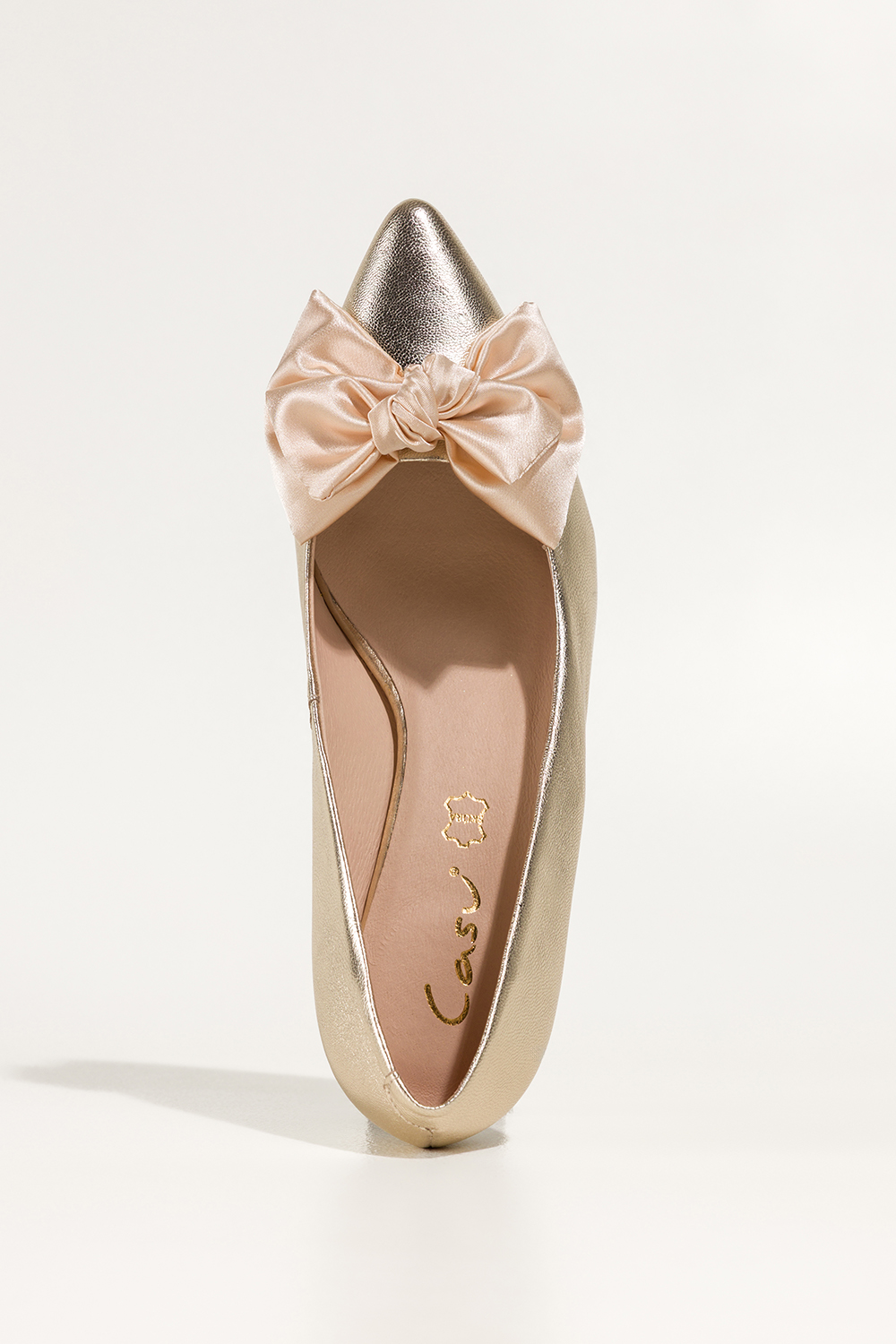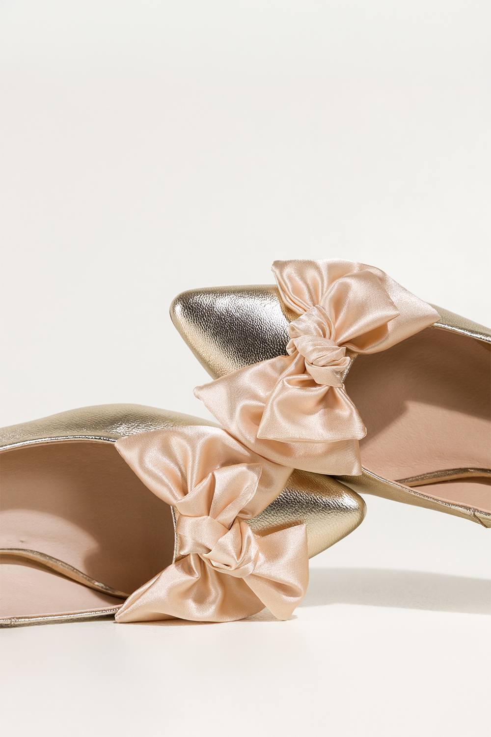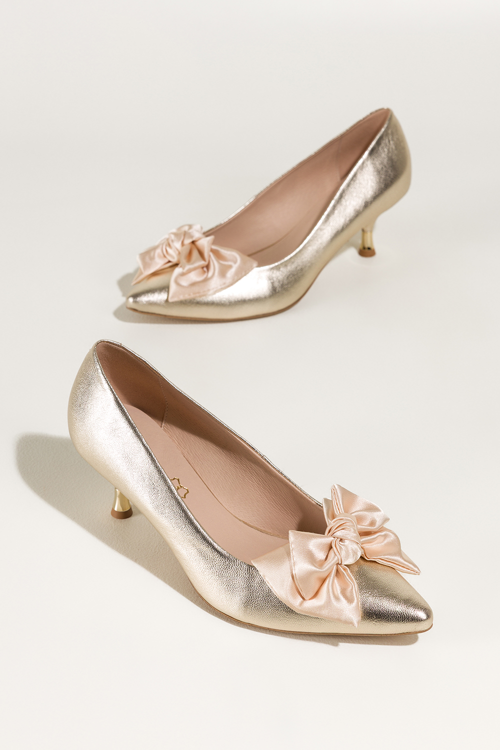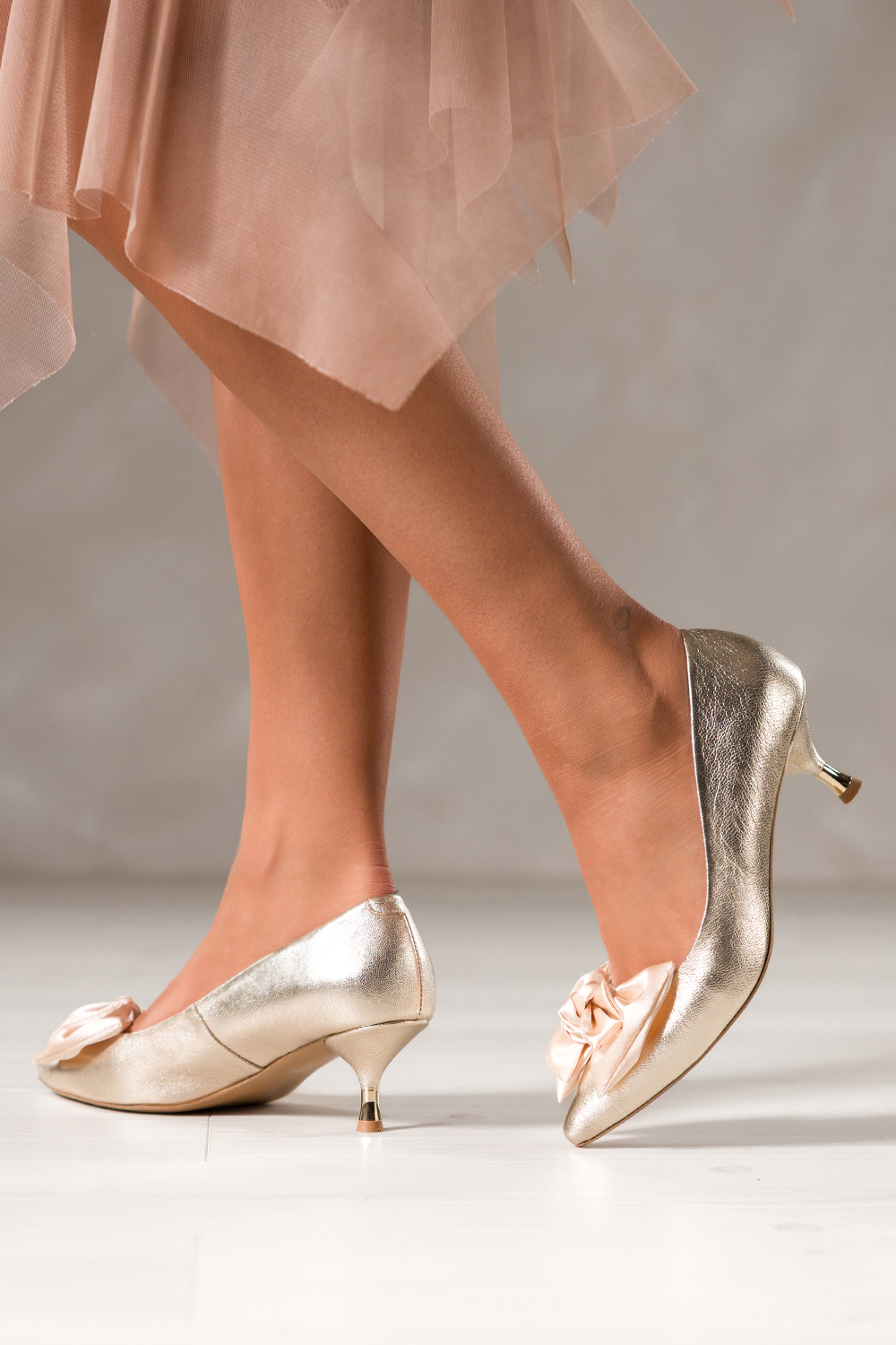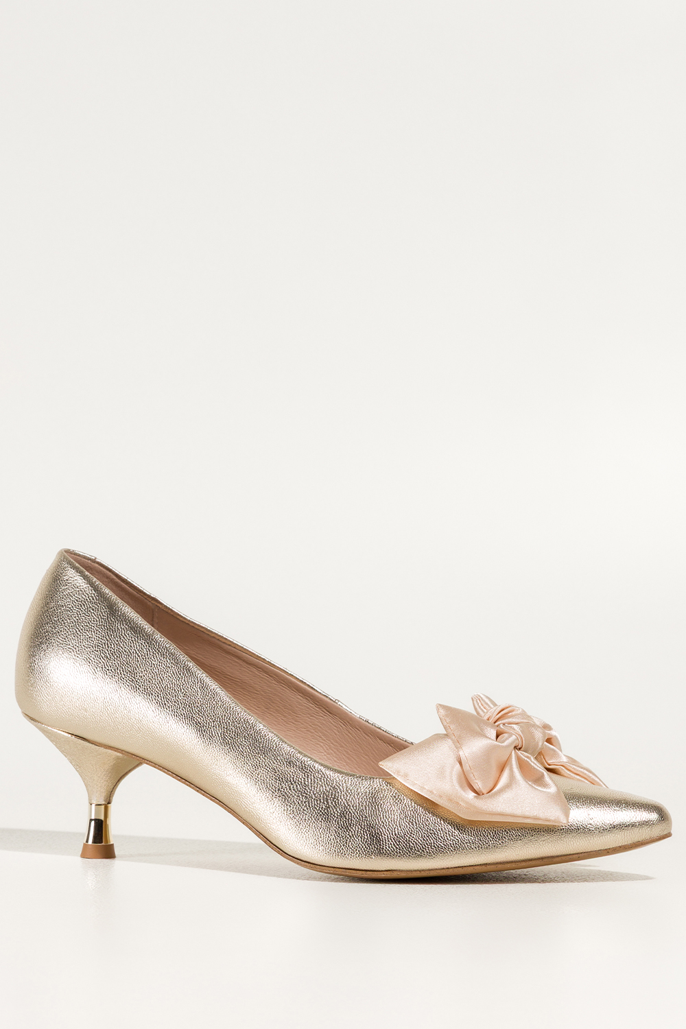 Złote czółenka skórzane damskie z satynową beżową kokardą niski obcas kieliszek PRODUKT POLSKI Cas