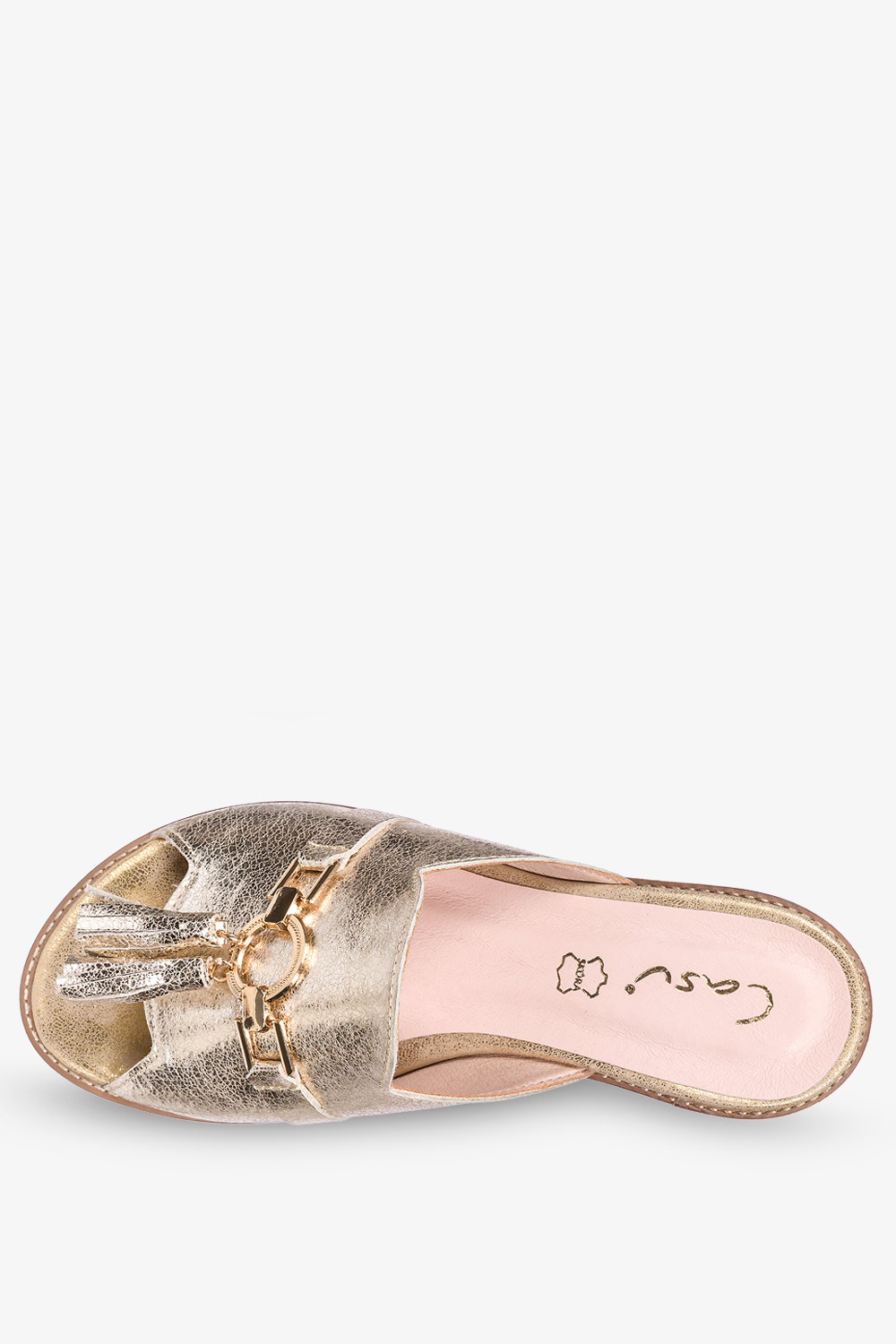 Złote klapki skórzane damskie z chwostami i złotą ozdobą PRODUKT POLSKI Casu 3226-W