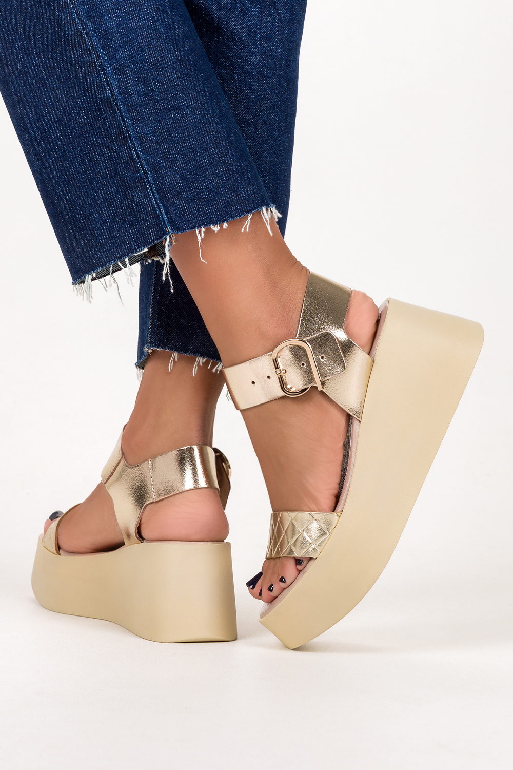 Złote sandały skórzane damskie na bieżnikowanej platformie pasek wokół kostki PRODUKT POLSKI Casu 0